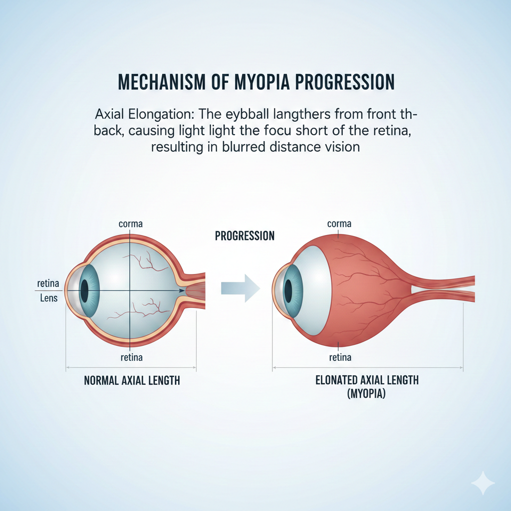 근시 진행으로 인해 안구 길이가 길어지는 메커니즘을 시각화한 메디컬 일러스트