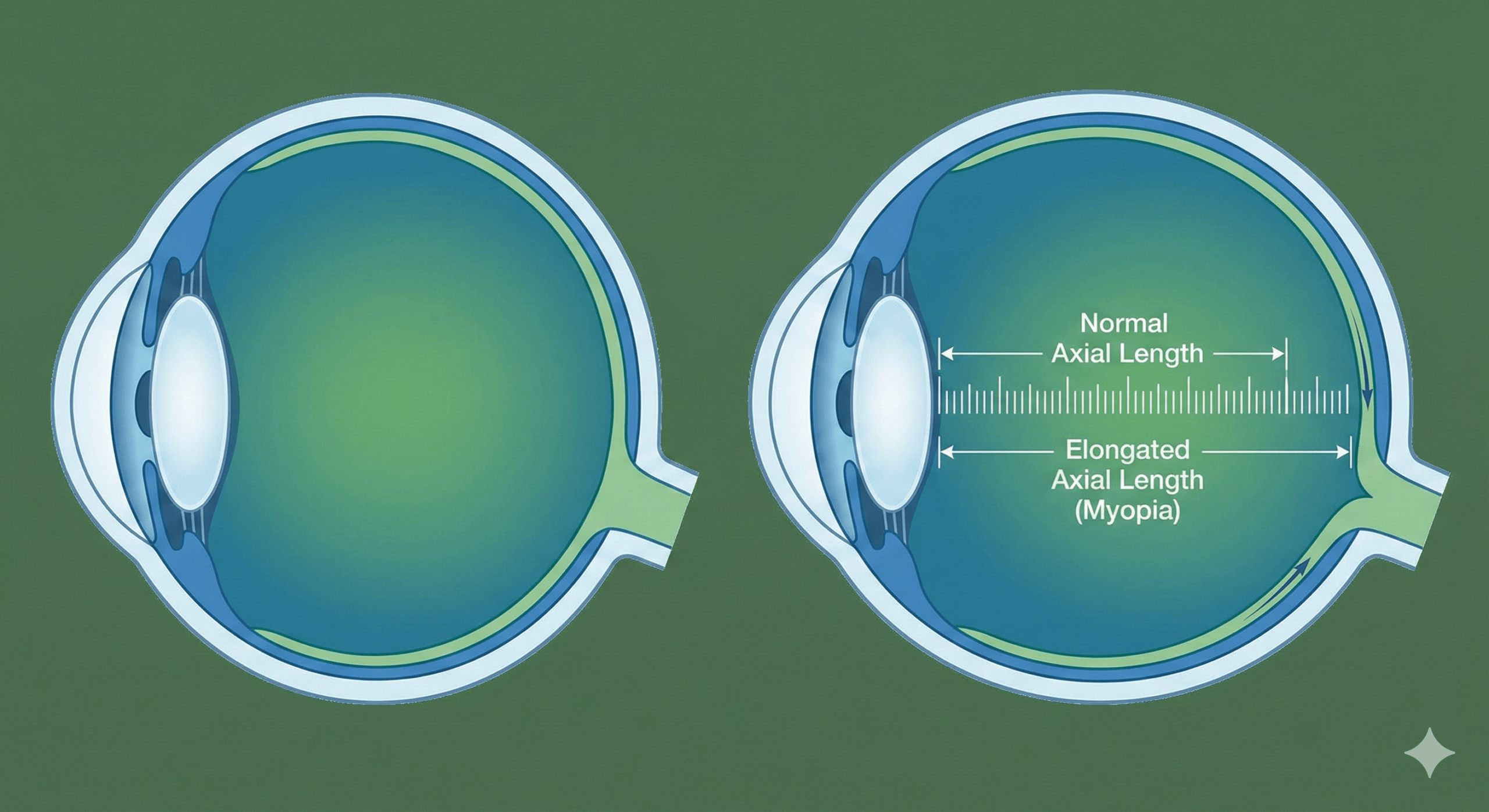 [닥터의 핵심 요약] 근시는 눈이 나쁜 것이 아니라, 안구가 길어지는 것입니다. 이를 ‘안축장’이라고 합니다. 안축장이 1mm 길어질 때마다 근시는 약 -3.0 디옵터씩 심해집니다. 성장기 아이의 눈 관리는 단순한 시력 교정이 아닌, 이 안축장의 성장을 억제하는 데 초점을 맞춰야 합니다.