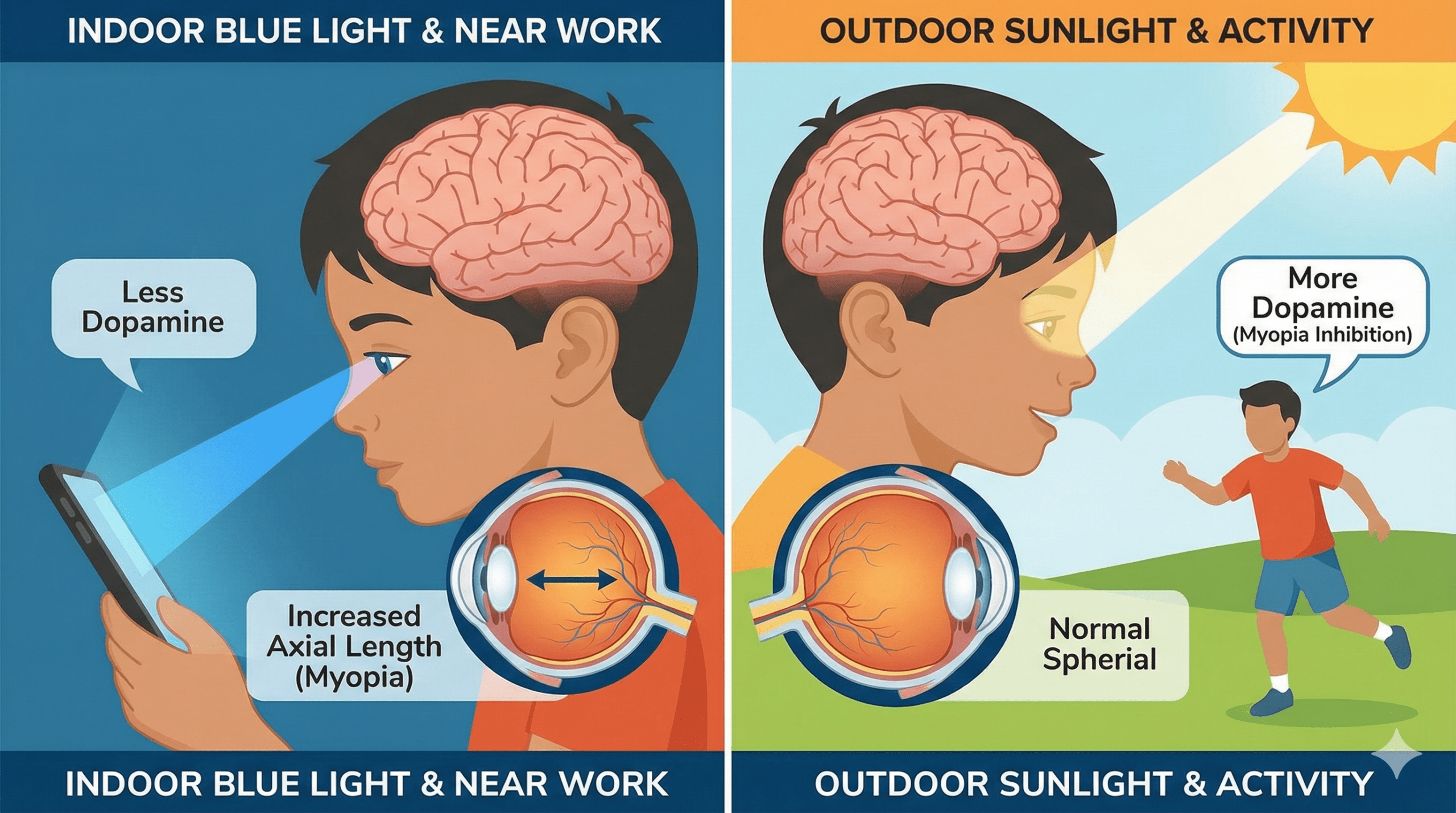 그렇다면 왜 아이들의 눈은 점점 나빠질까요? 핵심은 ‘안축장’입니다. 안축장은 각막에서 망막까지의 길이를 말합니다. 키가 크듯이 아이들의 안구도 자라는데, 근거리 작업을 과도하게 하면 초점을 맞추기 위해 안구가 뒤로 길어지면서 근시가 급격히 진행됩니다. 한번 길어진 안구는 다시 짧아질 수 없으며, 이는 고도근시나 망막 질환의 위험을 높이는 주범이 됩니다.